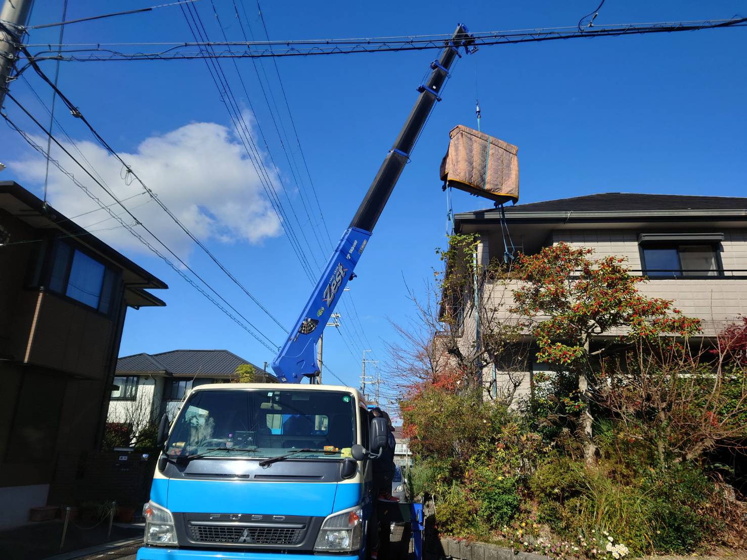 搬入時にも吊り上げたとのことでユニック車にてベランダより吊り下ろし作業でのご対応となりました。しっかり荷物とお部屋に養生をし細心の注意を払い搬出していきます。